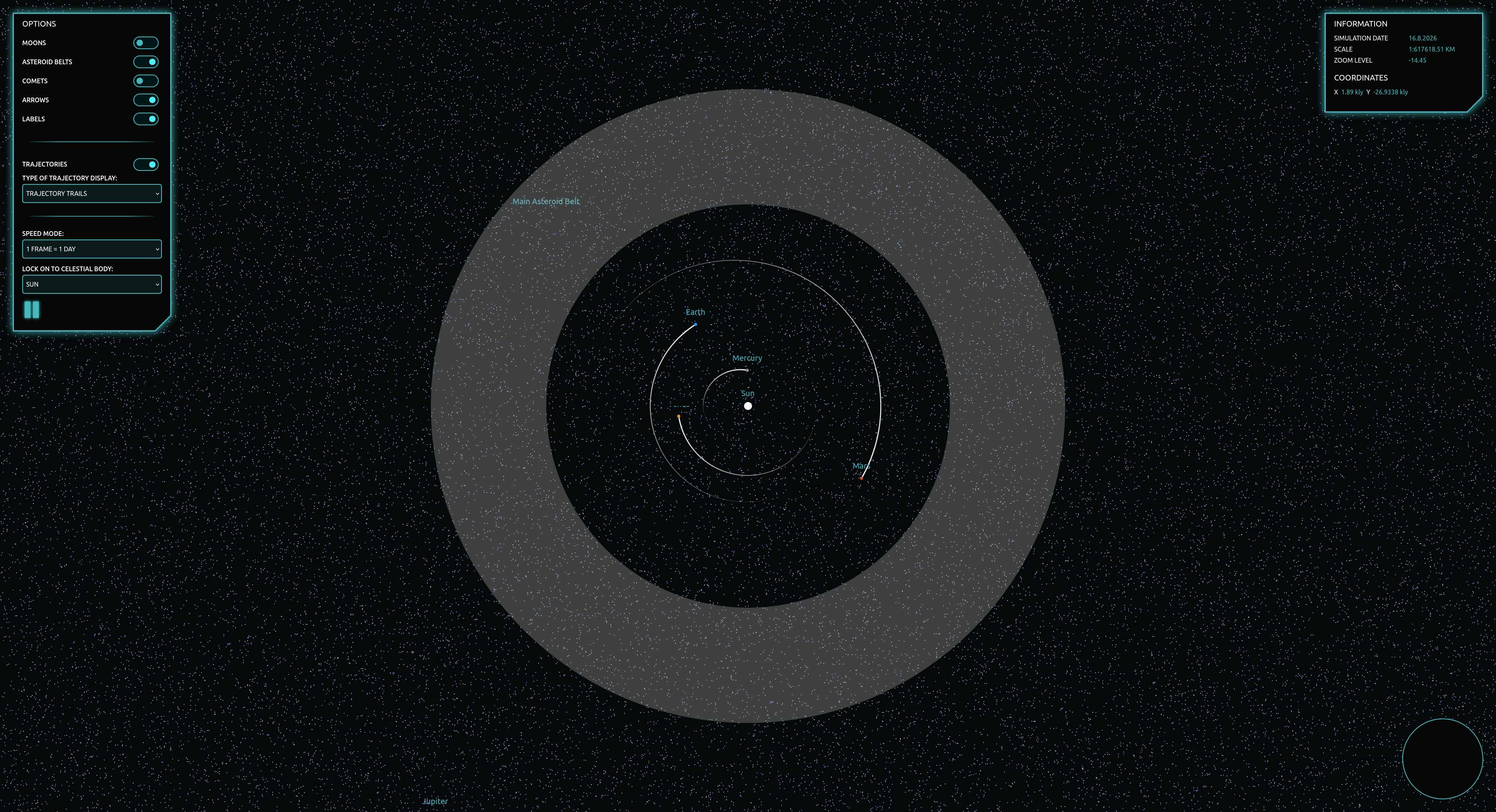 Interstellar is a small project I dabble with from time to time between clients. The goal is to ultimately have a 1:1 simulation of our galaxy and to be able to view information and follow all known celestial bodies, including calculating trajectories of asteroids.
